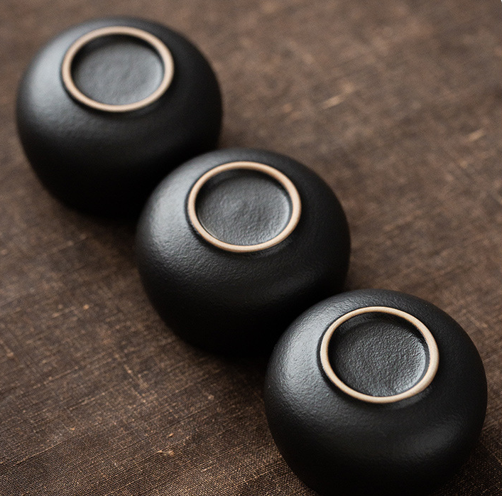 3Set: black pottery pot with beams, one pot and four cups + tea caddy + tea tray,