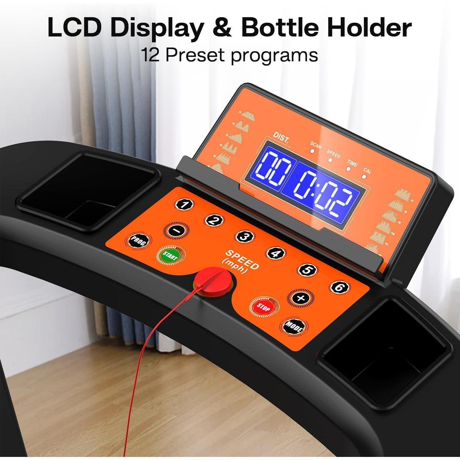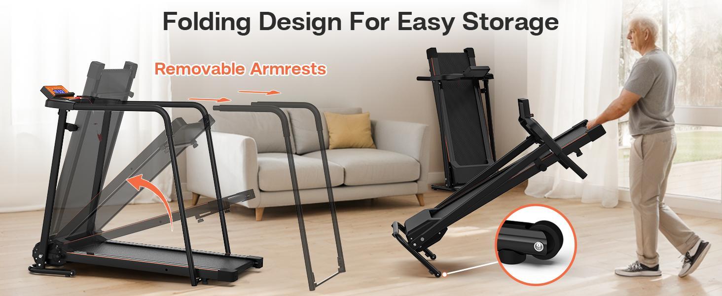 Convenient & comfortable design:Seniors treadmill with multi-function LED display, P: 12 preset programs, M: 3 control modes, +: speed+, -: speed-. It is convenient to clearly show and track time, speed, distance, and calories, making your workouts clear at a glance to achieve different training goals. In addition, it is also equipped with a cup holder, tablet/mobile phone holder, safety key, and armrests to facilitate your exercise.
