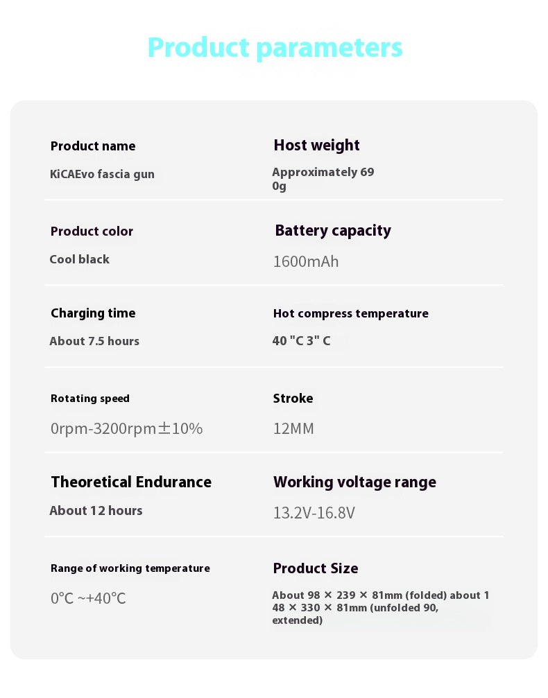 Functions: folding, hot compress, low noise mute, multi-gear frequency conversion